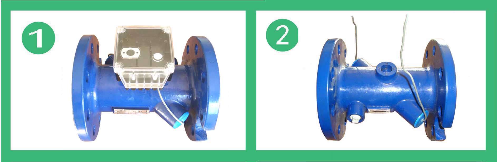 b.樓棟型熱量表超聲波流量計由表殼、換能器、換能器座組成。順流方向和逆流方向,換能器1或換能器2發射的超聲波信號由換能器2或換能器1接收。